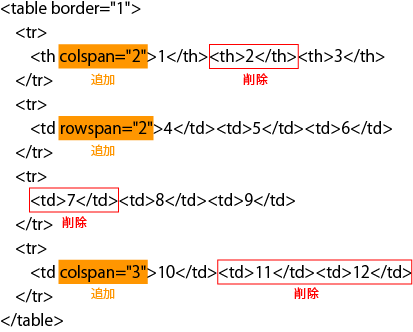 表の中でセルを結合する場合は、結合属性であるcolspan・rowspanを使用します。