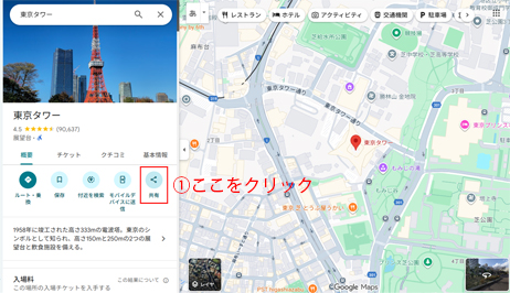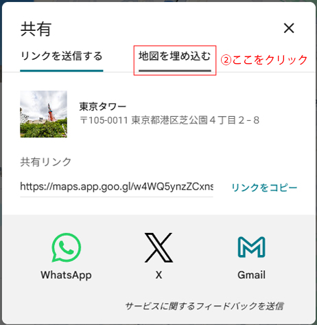 Googleマップも同様に、共有機能から簡単に埋め込みコードを取得できます。
