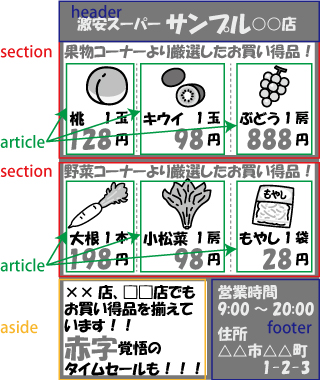 特にsection、article、asideは理解しにくいため、実際のWebページとは少し離れた「スーパーのチラシ」を使って例えると、それぞれの役割が非常に分かりやすくなります。
