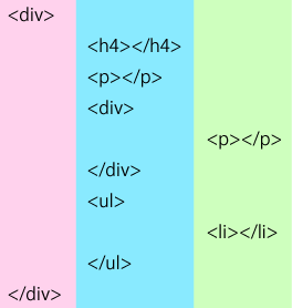 ピンクの背景に含まれる要素が親、水色の背景に含まれる要素が子、緑の背景色に含まれる要素が孫となります。