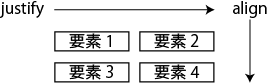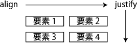 そのため、決めた並べ方によりjustifyとalignの方向が変わります。